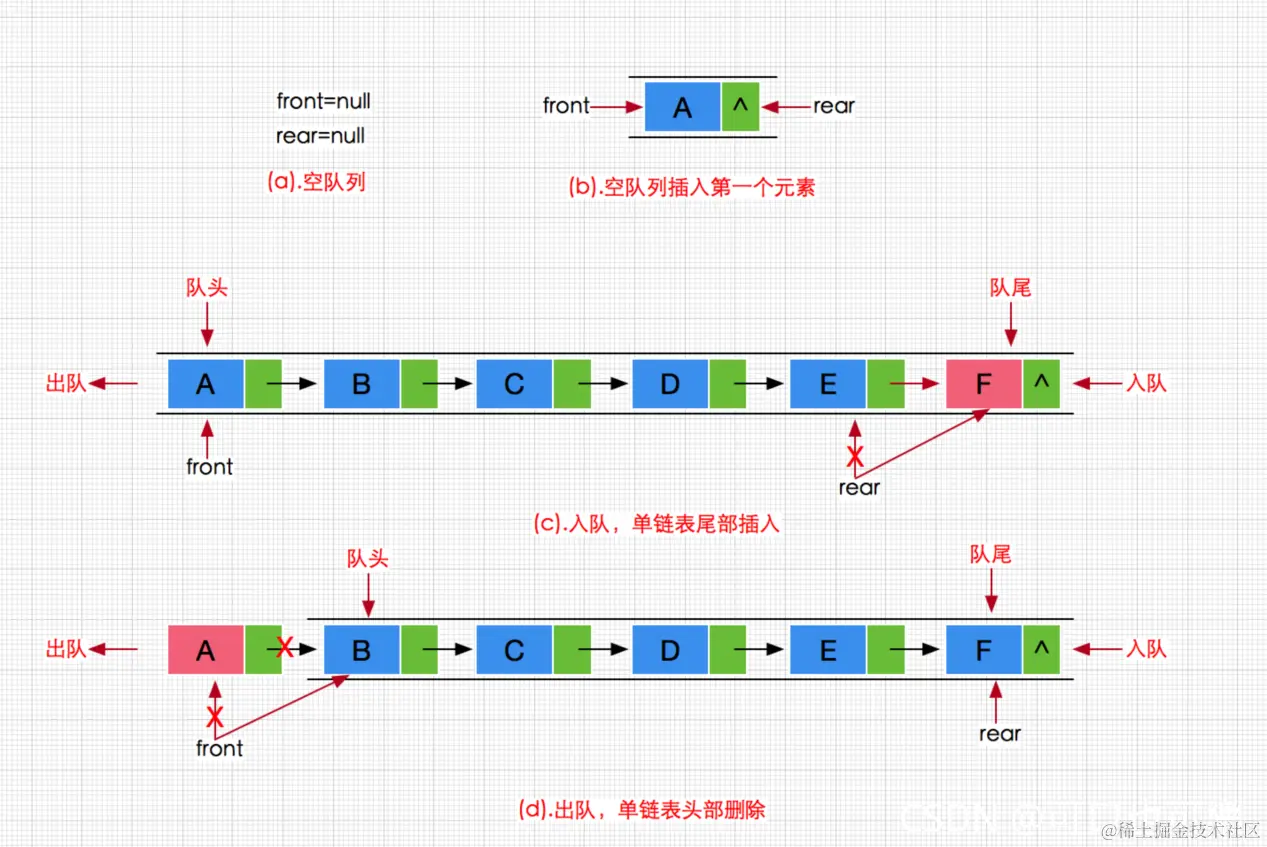 最开始没有数据,即头指针和尾指针都为NULL