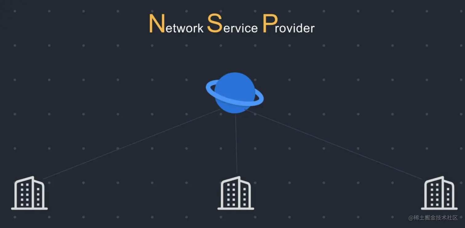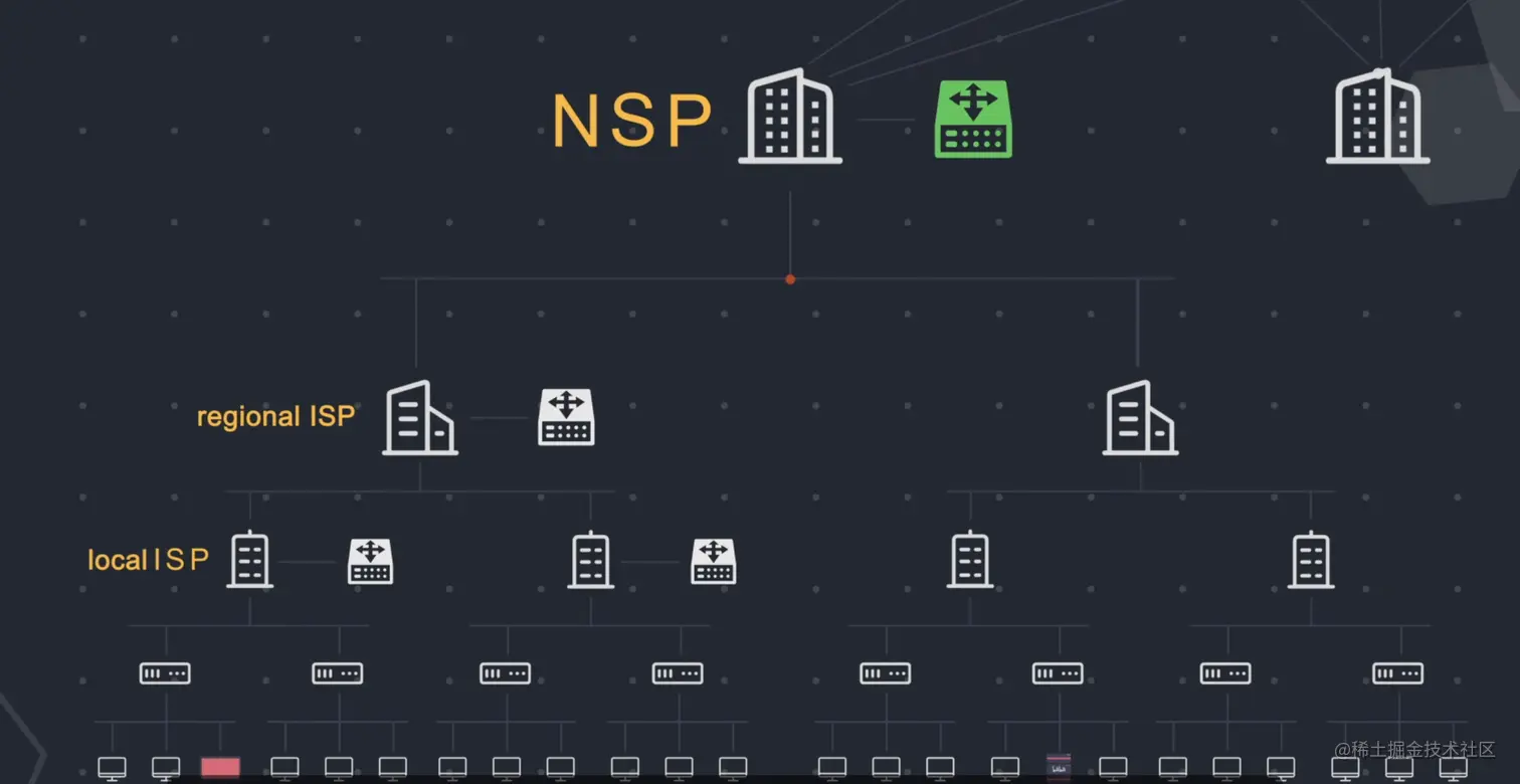 互联网骨干网由许多相互连接的大型网络组成,这些大型网络被称为网络服务提供商 Network Service Provider,简称NSP。NSP是为ISP提供网络主干服务的公司,ISP可以从NSP那里批量购入带宽,为客户提供网络接入服务。