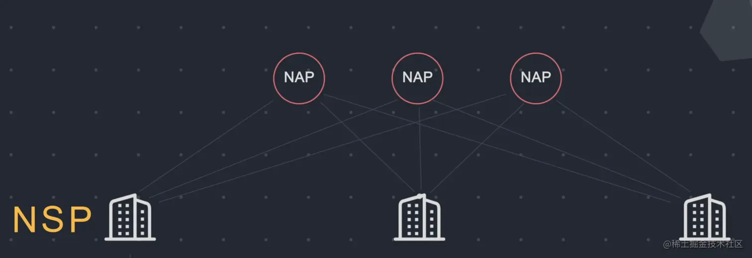 NSP网络通过网络访问点NAP(network access point)相连 来交换数据包流量。每个NSP都必须连接到至少三个NAP。数据包流量可能会通过NAP 从一个NSP的主干跳到另一个NSP的主干。