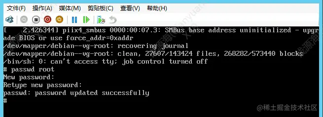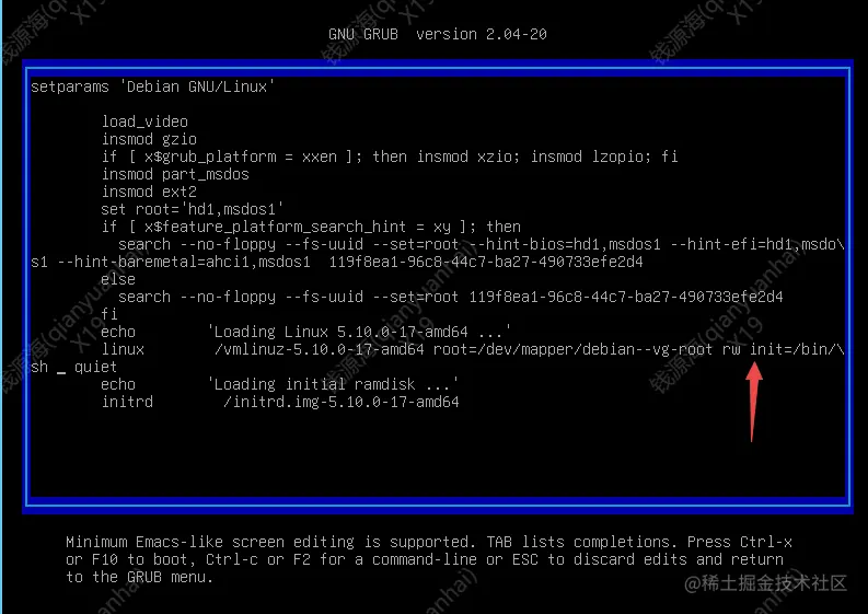debian系统修改root用户密码 胖大大海 2022-09-28 163 阅读1分钟 debian系统 root用户密码忘记了怎么办?? 第一步 内核界面按e进入编辑模式 ****将“ro”替换为“ ****rw init=/bin/sh ”\ ************\ 第二步 ctrl x 进入系统修改密码\ passwd root 修改密码 \ 这样子密码就修改成功了,缺乏机器练手的小伙伴们可以去cnaaa看看!\ 小贴士:debian网卡配置文件在 /etc/network/interfaces