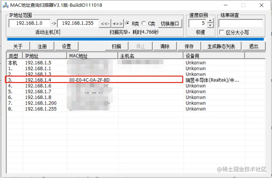 连接网线,打开MAC地址查询扫描器,点击扫描