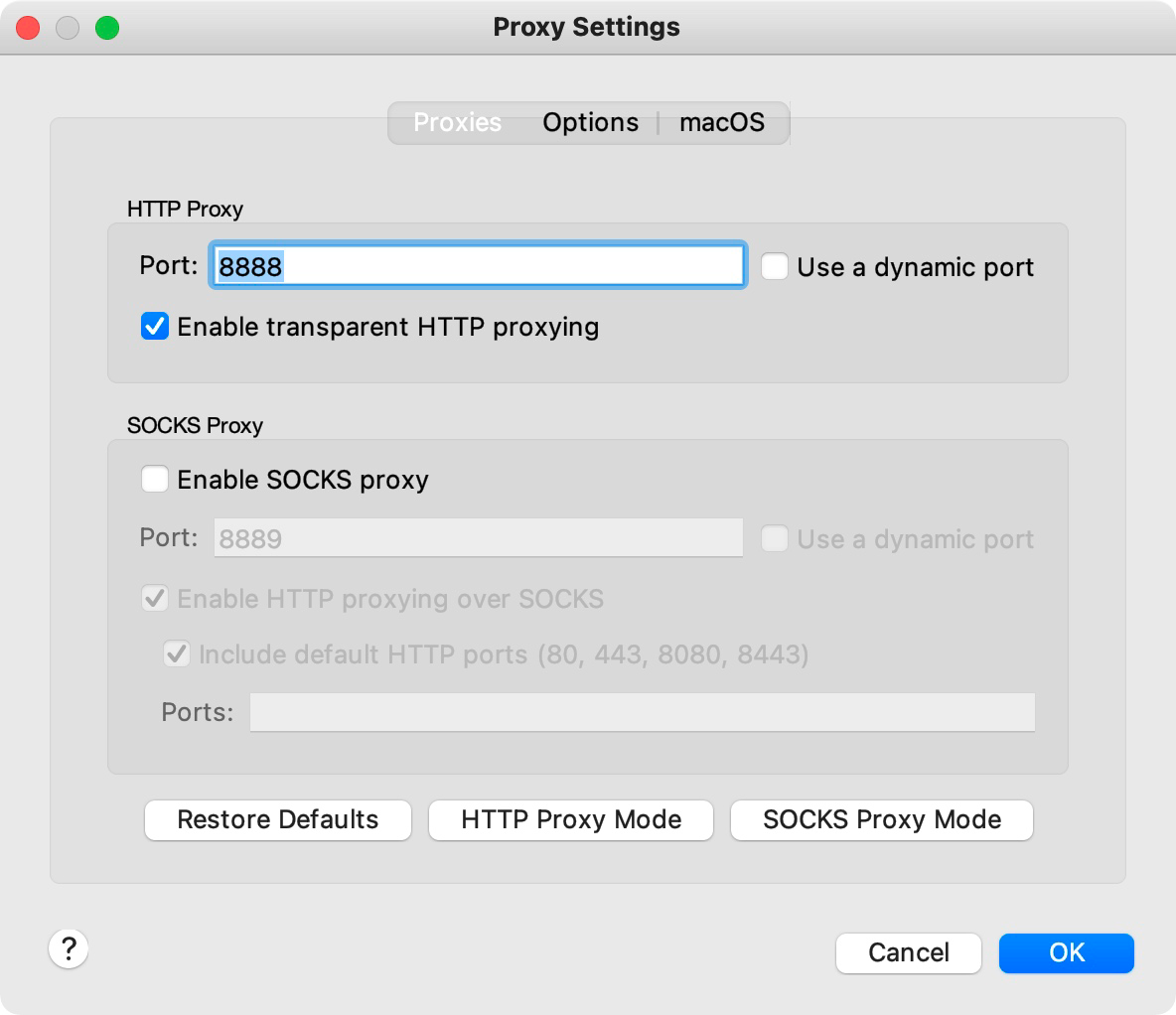 - 选择菜单中的 Proxy -> Mac OS X Proxy