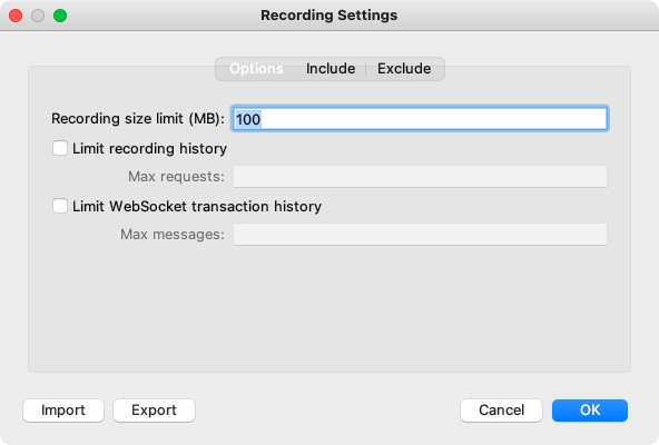 Recording Settings 有 Options、Include、Exclude 三个选项卡: