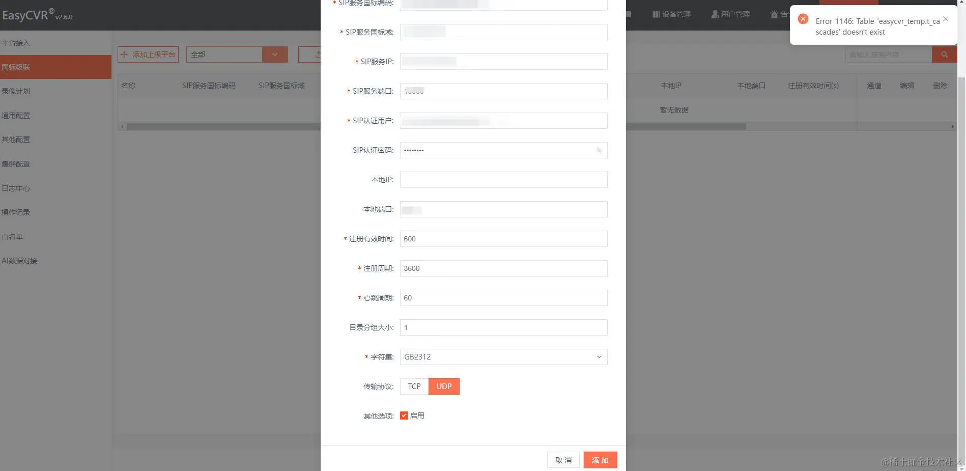 有用户反馈,在部署EasyCVR平台后,使用MySQL数据库配置级联,但是出现了报错情况(如下图):“Error 1146:Table ‘easycvr_tempt_cascades’ doesn’t exsit",请求我们协助排查。