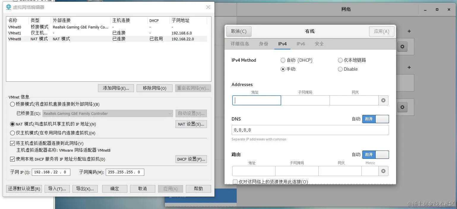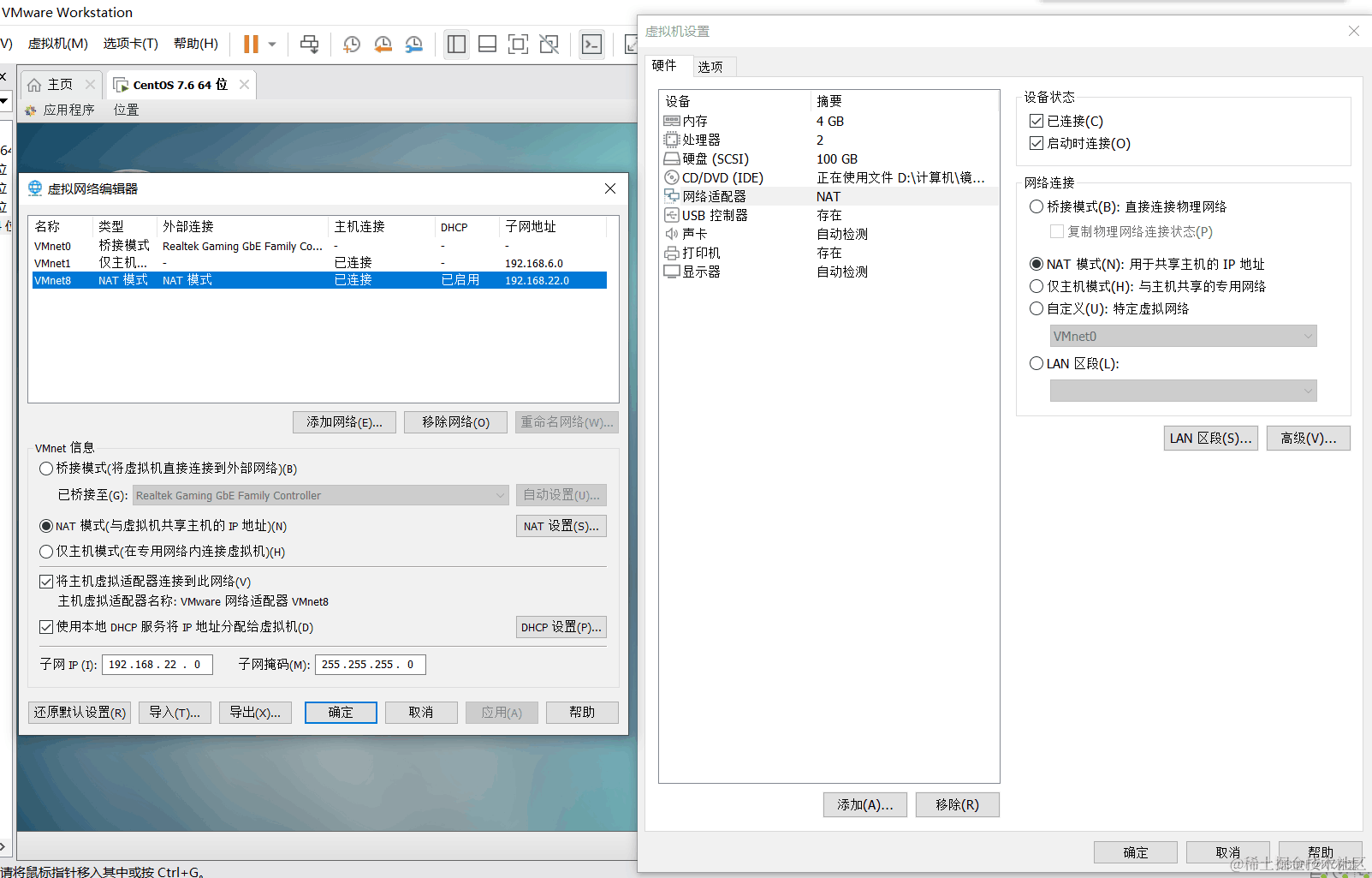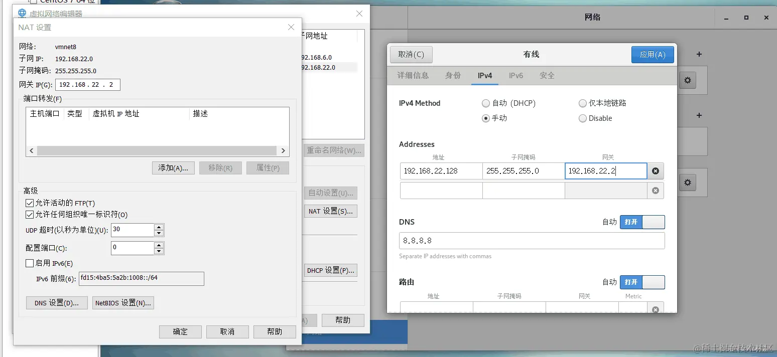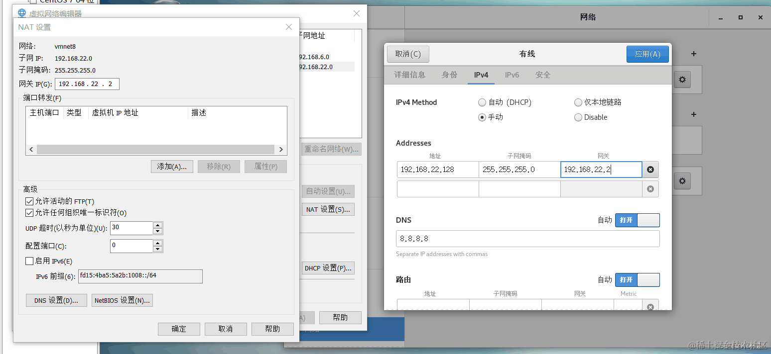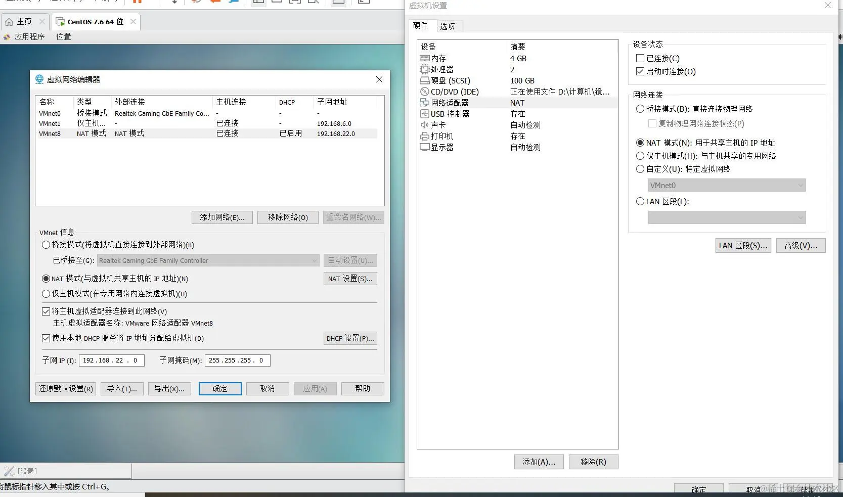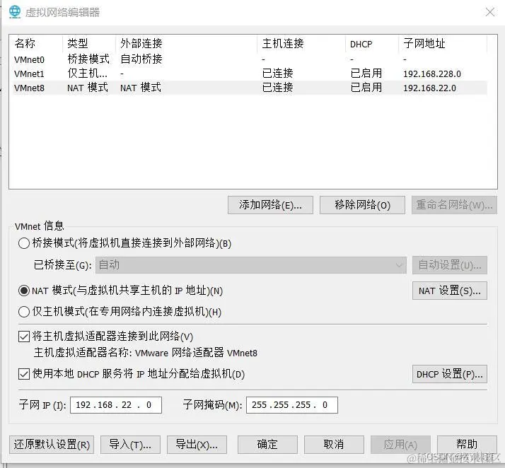 在NAT网络中,会用到VMware Network Adepter VMnet8虚拟网卡,主机上的VMware Network Adepter VMnet8虚拟网卡被直接连接到VMnet8虚拟交换机上与虚拟网卡进行通信。VMware Network Adepter VMnet8虚拟网卡的作用仅限于和VMnet8网段进行通信,它不给VMnet8网段提供路由功能,