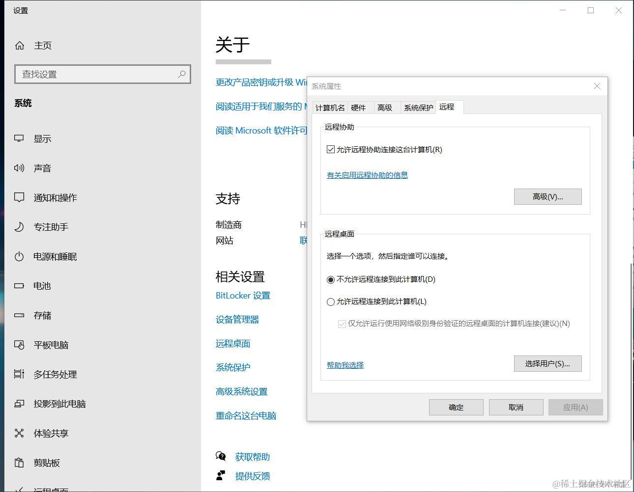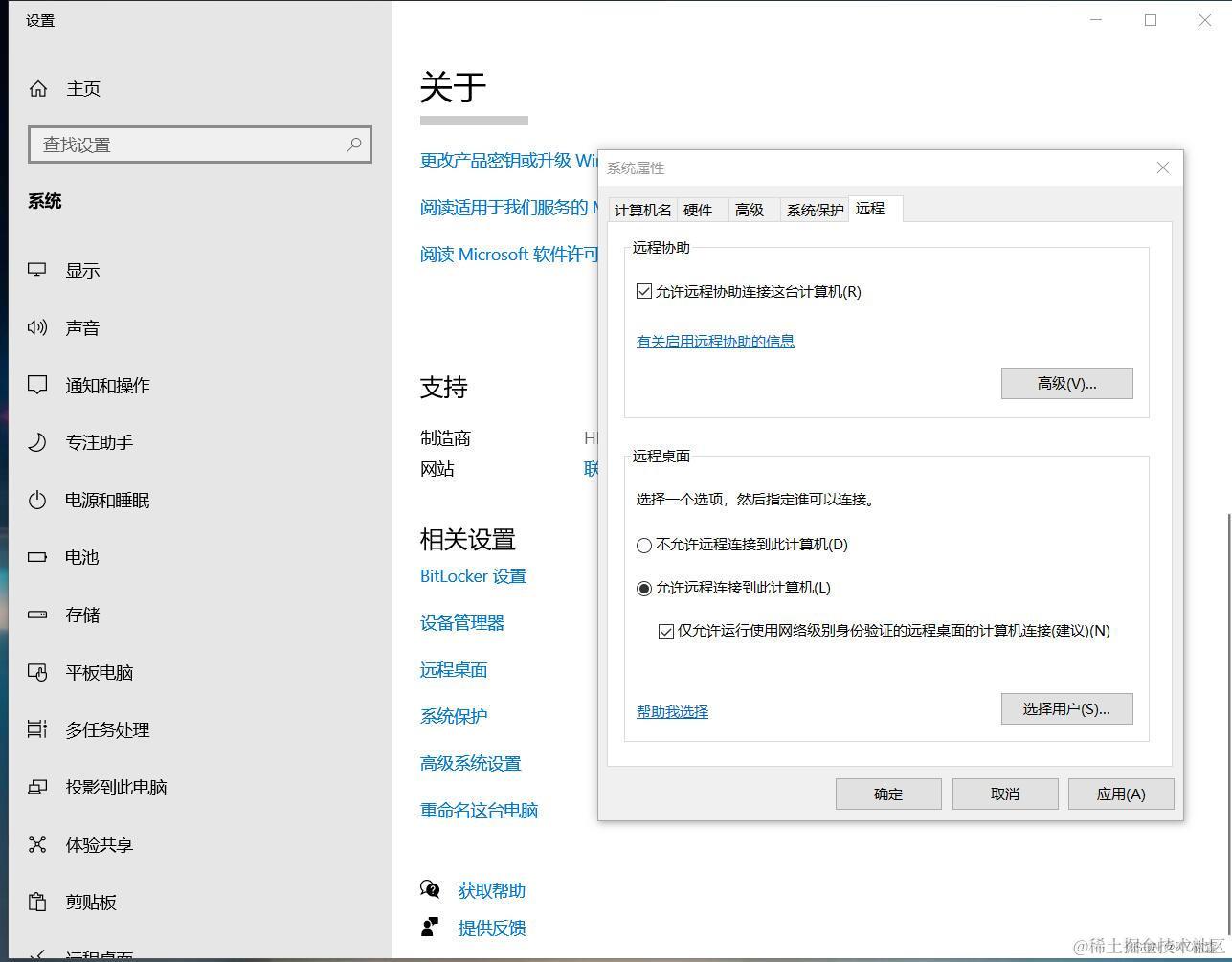 2 .右击此电脑属性,打开如下界面,选择高级系统设置里的远程,勾选允许远程协助连接这台计算机和允许远程连接到此计算机以及仅允许运行使用网络级别身份验证的远程桌面的计算机连接。