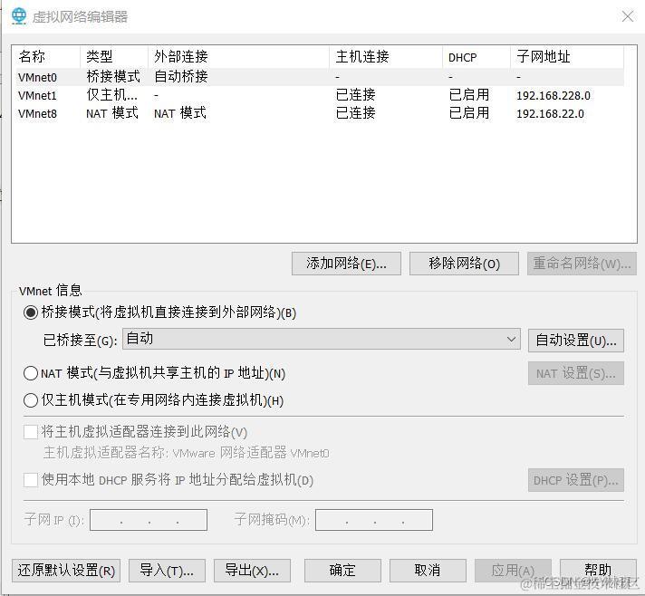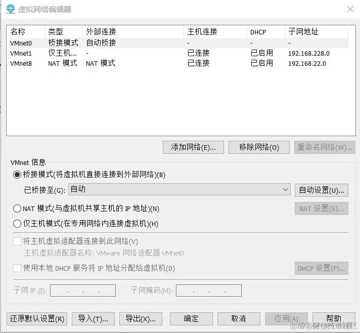 VMnet0:用于虚拟桥接网络下的虚拟交换机。