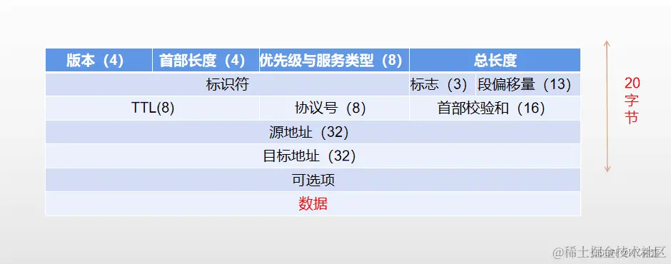 注:iP头部数据段可能20字节也有可能多总长度加上数据段长度最长为65535字节。