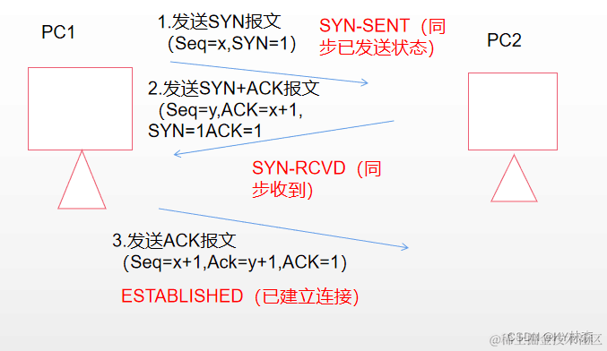 3.第三次握手:PC1收到PC2的信息后,还要给PC2发消息确认自己已经收到了(已建立链接)