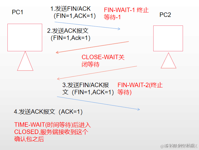 4.第四次挥手:PC1收到PC2请求断开连接的消息后,也要发送ACK报文给PC1,然后断开连接。(时间等待)