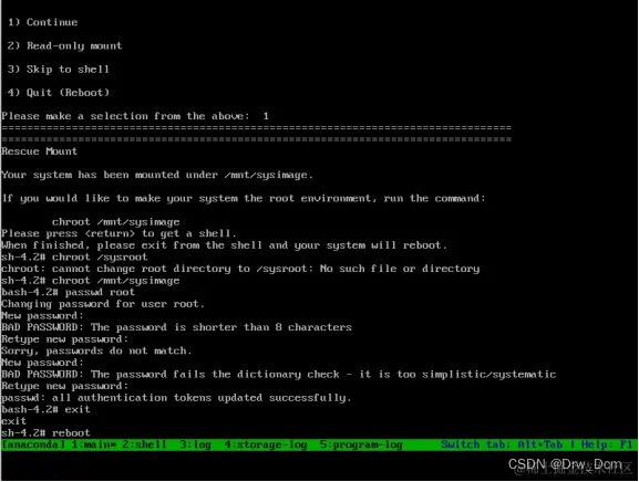 执行exit命令退出临时Shell环境,系统将会自动重启