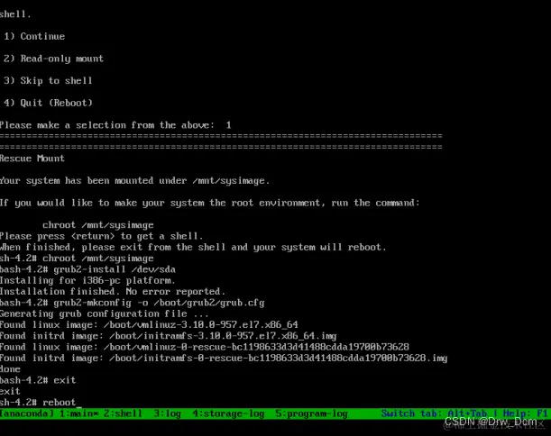 (2)进入急救模式,重写或者从备份中恢复grub.conf