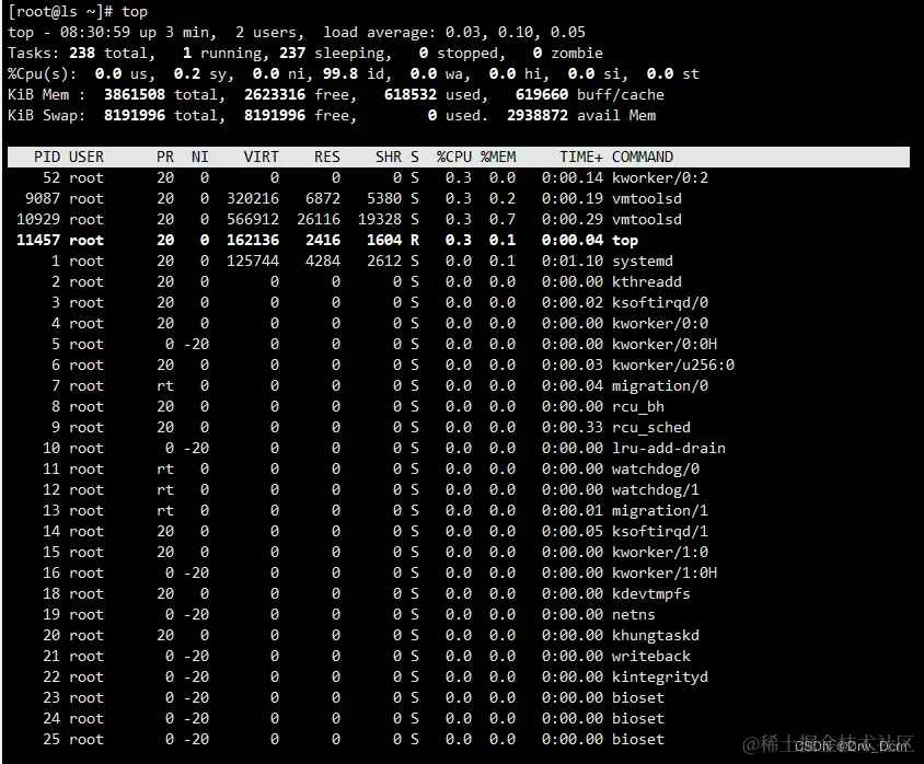 us,用户占用: sy,内核占用: ni,优先级调度占用; id,空闲CPU; wa,I/O,等待占用: hi,硬件中断占用: si,软件中断占用: st,虚拟化占用。要了解空闲的CPU百分比,主要看%id部分。