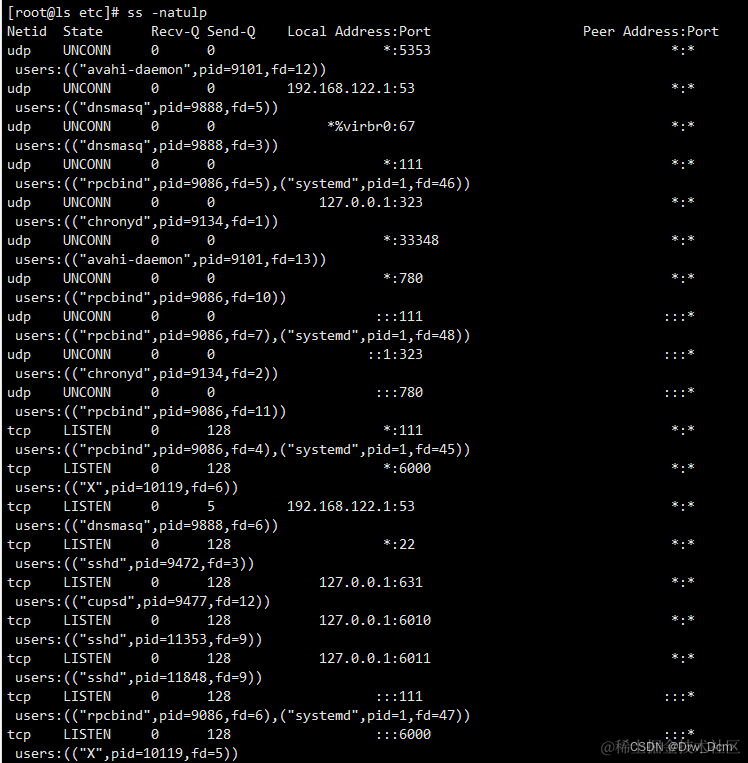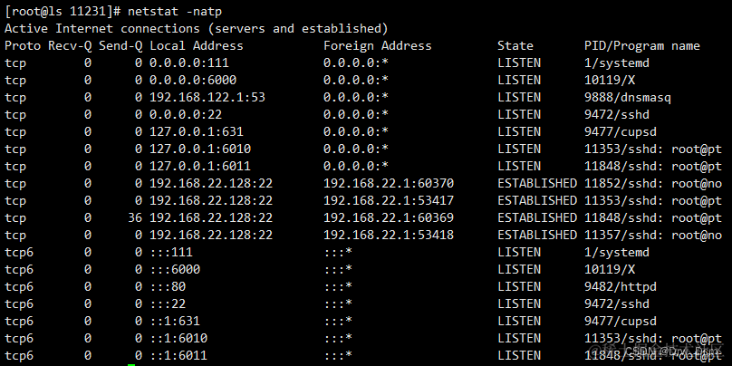 -l 显示处于监听(Listening)状态的网络连接及端口信息。