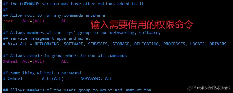 visudo:标准格式:用户/%组名(表示组) 主机名=命令(绝对路径)