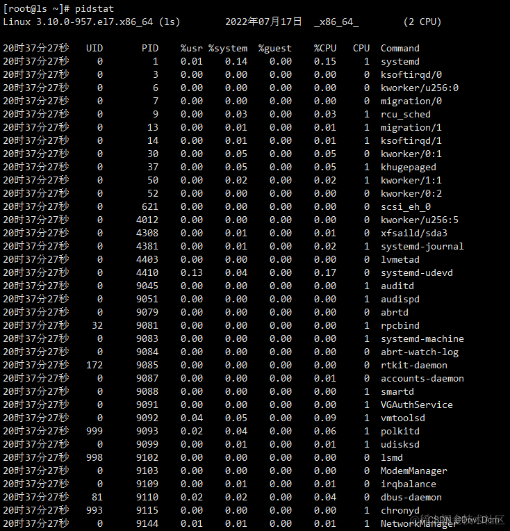 注意:task和子线程的全局的统计信息和pidstat选项无关。这些统计信息不会对应到当前的统计间隔,这些统计信息只有在子线程kill或者完成的时候才会被收集。