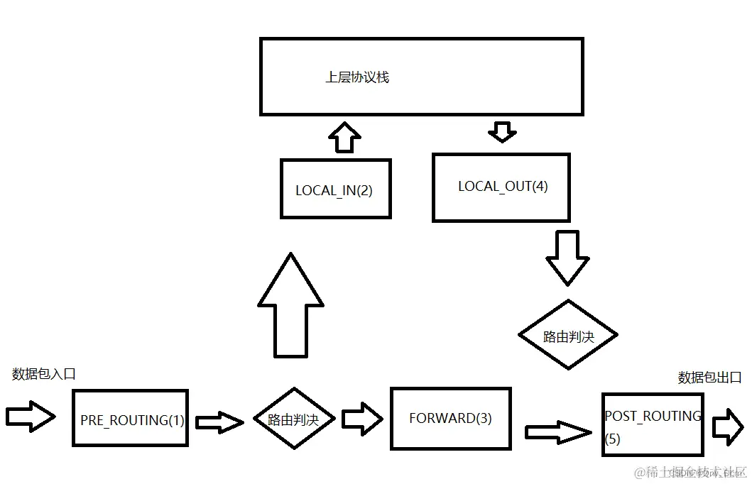 Netfilter在内核中选取五个位置放了五个hook(勾子) function(INPUT、OUTPUT、FORWARD、PREROUTING、POSTROUTING),而这五个hook function向用户开放,用户可以通过一个命令工具(iptables)向其写入规则。