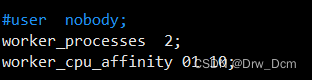 worker_cpu_affinity 01 10; 设置每个进程由不同的cpu处理、进程数配为4时,为0001 0010 0100 1000