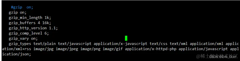 gzip_types text/plain text/javascript application/x-javascript text/css text/xml application/xml application/xml+rss image/jpg image/jpeg image/png image/gif application/x-httpd-php application/javascript application/json; 压缩类型,表示哪些网页文档启用压缩功能