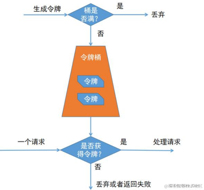 令牌桶算法的原理是系统以恒定的速率产生令牌,然后把令牌放到令牌桶中,令牌桶有一个容量,当令牌桶满了的时候,再向其中放令牌,那么多余的令牌会被丢弃;当想要处理一个请求的时候,需要从令牌桶中取出一个令牌,如果此时令牌桶中没有令牌,那么则拒绝该请求。