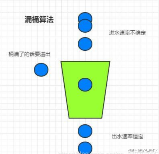 漏桶算法思路很简单,请求先进入到漏桶里,漏桶以固定的速度出水,也就是处理请求,当水加的过快,则会直接溢出,也就是拒绝请求,可以看出漏桶算法能强行限制数据的传输速率。