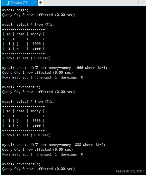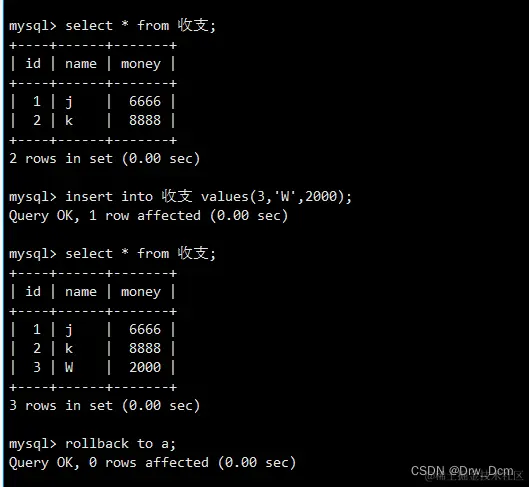 savepoint s1:使用savepoint 允许在事务中创建一个回滚点, 一个事务中可以有多个savepoint: “s1"代表回滚点名称。