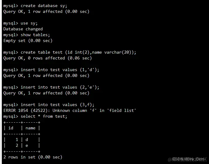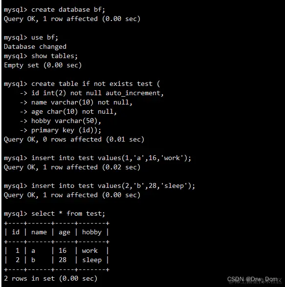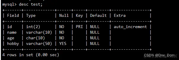 create table test1 (id int(2),name varchar(4));
