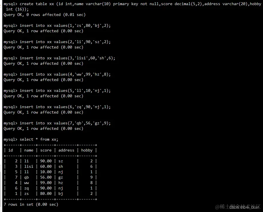 create table 表名 (id int, name varchar(10) primary key not null,score decimal(5,2),address varchar (20), hobbid int(5));