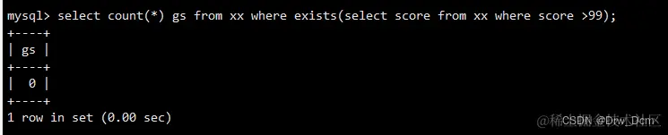查询如果存在分数小于50的记录则计算info的字段数, info表没有小于50的,所以返回0select count(*) from 表名 where exists (select id from 表名 where score<50);子查询,别名as