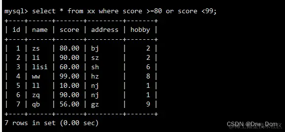 select * from 表名 where score >80 and score <=99; select * from 表名 where score >80 or score <=99;嵌套/多条件