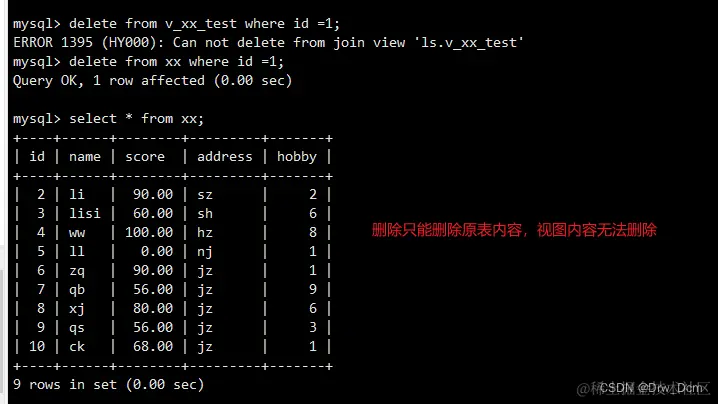 select * from v_score; select * from 表名;修改表不能修改以函数、复合函数方式计算出来的字段