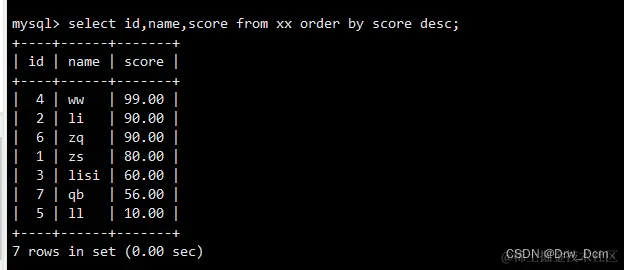 order by还可以结合where进行条件过滤,筛选某个地址的学生按分数降序排列