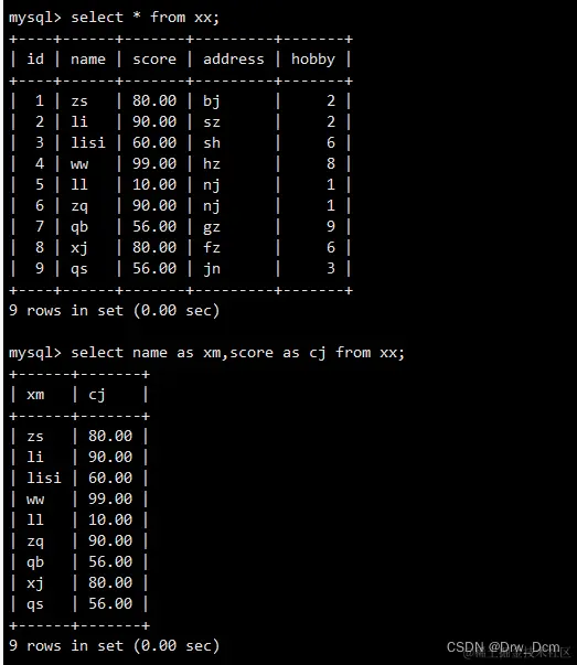select name as 姓名,score as成绩 from info;如果表的长度比较长,可以使用as给表设置别名,在查询的过程中直接使用别名。
