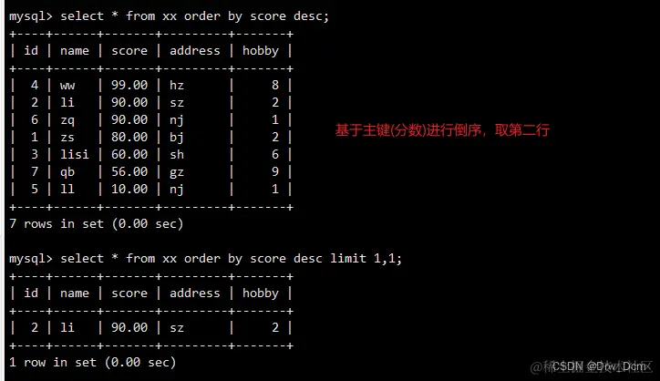 ①查询学生信息先按兴趣id降序排列,相同分数的,id也按降序排列。select id, name, hobbid from 表名 order by hobbid desc, id desc;②查询学生信息先按兴趣id降序排列,相同分数的,id按升序排列