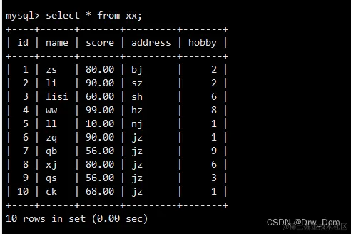 数据库有一张表,记录了id,姓名,分数,地址和爱好