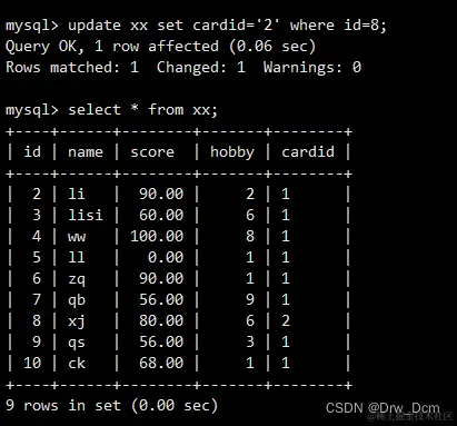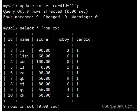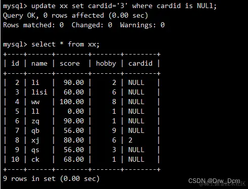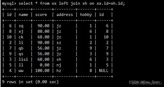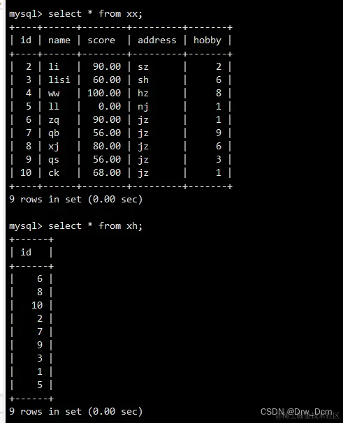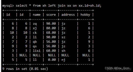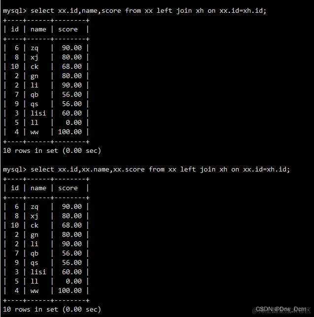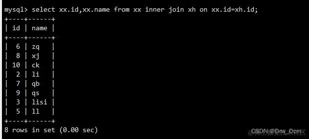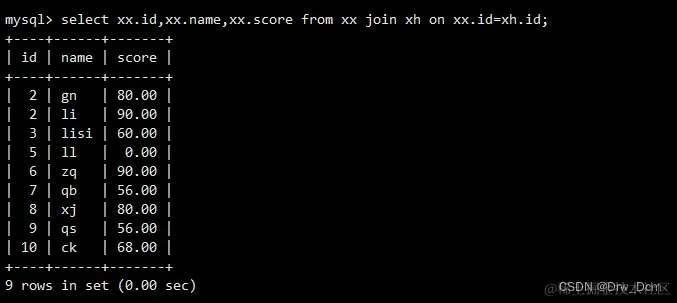 select colunn_name (s) from 表名 inner join 表名 on 表名.column_name = 表名.column_name; create table 表名 (name varchar(40),score decimal (4,2),address varchar(40)); insert into 表名 values ('wangwu',80,'beijing'),('zhangsan',99,'shanghai'), ('lisi',100, 'nanjing'); select * from 表名; select 表名.id, 表名.name from 表名 inner join 表名 on 表名.name-表名.name;内连查询:通过inner join的方式将两张表指定的相同字段的记录行输出出来