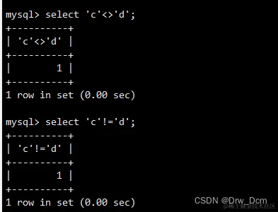 select 'abc'<>'cba' ,2<>2,3!=2, null<>null;