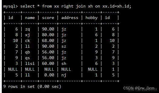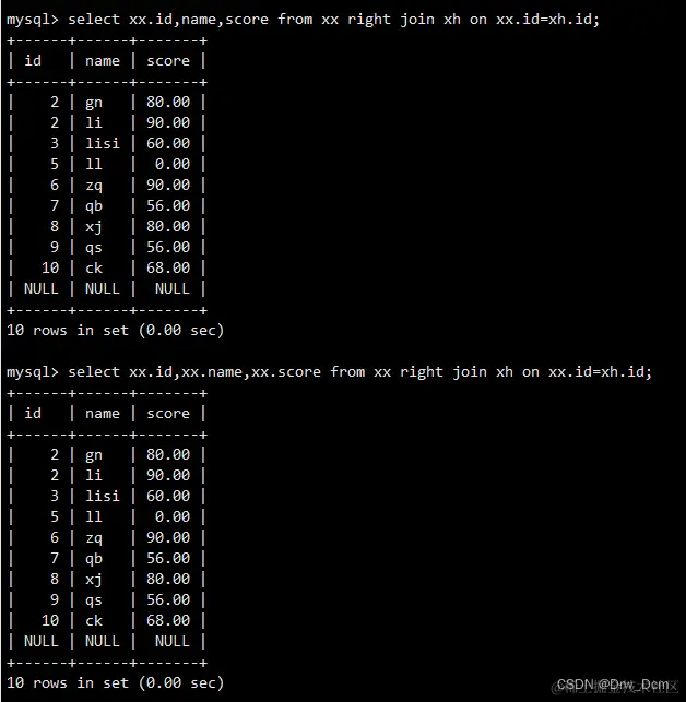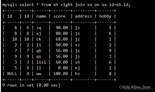 select * from 表名 right join 表名 on 表名.name-表名.name;在右连接的查询结果集中,除了符合匹配规则的行外,还包括右表中有但是左表中不匹配的行,这些记录在左表中以NULL补足。