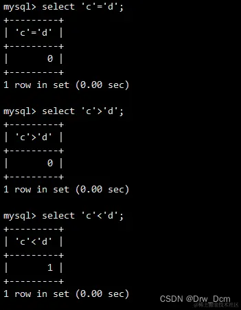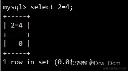 与linux返回值表达相反,linux中运行正常返回值是0,运行异常返回值是非0。select 2=4,2=2,2='2','e'='e','r'=null;(1)如果两者都是整数,则按照整数值进行比较。