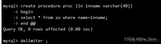 delimitelr @@ create procedure proc2 (in inname varchar (40) ) begin select * from 表名 where name=inname; end @@ delimiter @@ call proc2 ('wangwu');