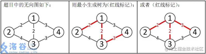 所以最小生成树的总边权为 2+2+3=72+2+3=7。