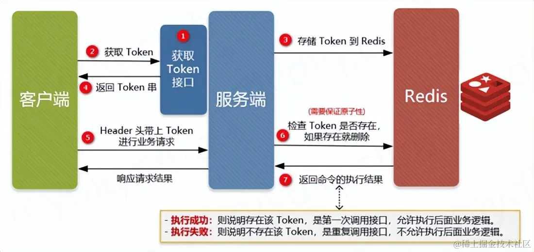简单地说就是调用方在调用接口的时候先向后端请求一个全局 ID(Token),请求的时候携带这个全局 ID 一起请求(Token 最好将其放到 Headers 中)。