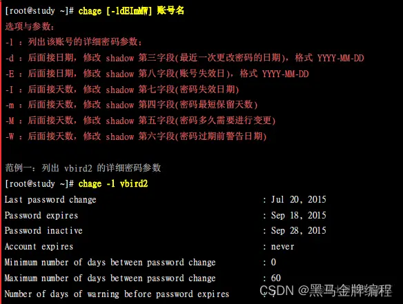 除了使用 passwd -S 之外,还有更详细的密码参数显示功能,那就是 chage 了!他的用