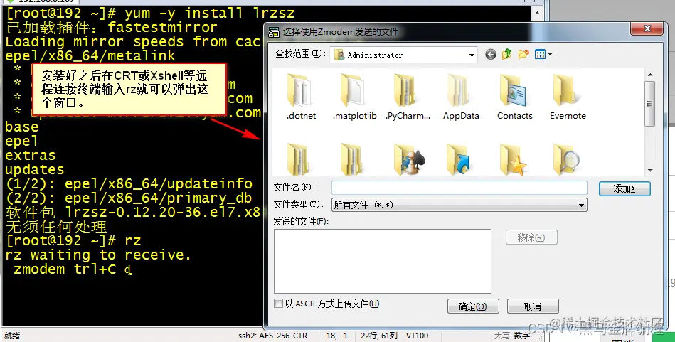 安装好后直接输入rz就可以弹出这个框就可以传输本地文件了。也可以在终端输入sz,这样可以将Linux的文件输出到window。