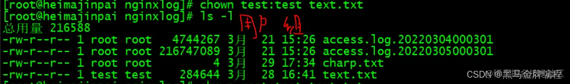 chown 用户名 文件名 --> 把其它用户创建的文件名转让给其他用户chown 用户名:组名 文件名 --> 把文件名的用户改为“其他用户名”,群组改为“其他组名”