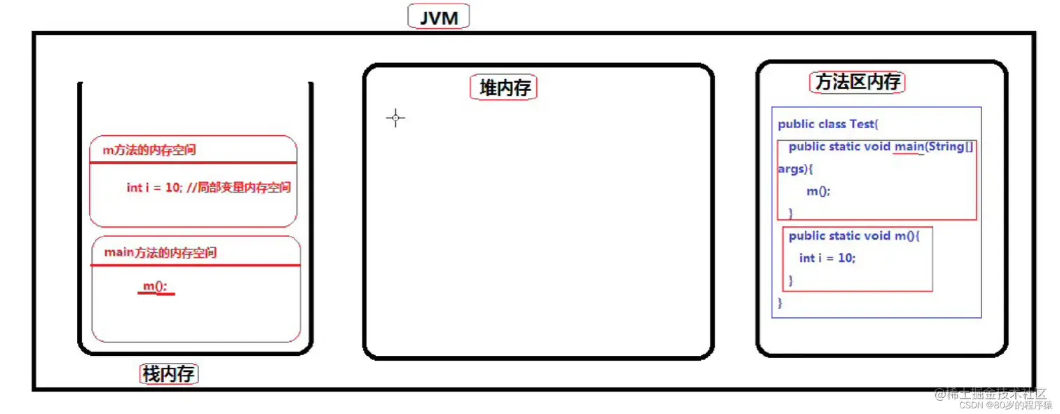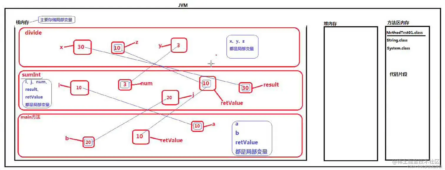 1)方法代码片段属于 .class字节码文件的一部分,字节码文件在类的加载的时候,将其放到了方法区当中。所以JVM中的三块主要的内存空间中方法区内存最先有数据。存在了代码片段;