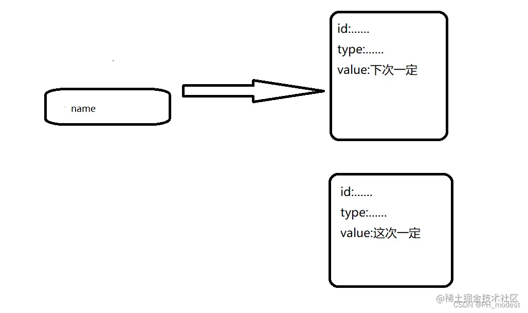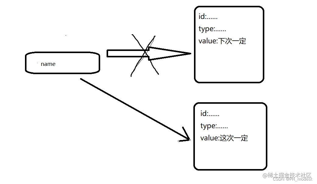 接下来第二句代码赋值给name之后,原来指向’下次一定‘的那块会断开,然后指向’这次一定‘的空间,那么’下次一定‘这个空间就没有使用,被称为内存垃圾,会由python的垃圾回收机制回收