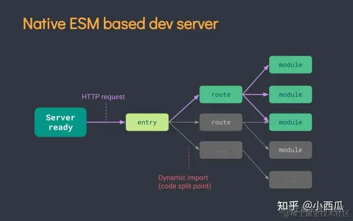 - 真正的按需编译,不再等待整个应用编译完成。 传统 webpack 编译:每次执行编译时,都会通过入口 entry 先去找到各个路由,再去加载每个路由各自的模块,然后会进行打包成为 bundle.js 文件,最后才通知服务器热更新。所以换句话说就是等所有文件加载就绪之后才去渲染更新页面的==》较慢