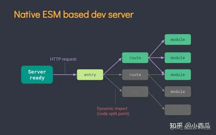 - 真正的按需编译,不再等待整个应用编译完成。 传统 webpack 编译:每次执行编译时,都会通过入口 entry 先去找到各个路由,再去加载每个路由各自的模块,然后会进行打包成为 bundle.js 文件,最后才通知服务器热更新。所以换句话说就是等所有文件加载就绪之后才去渲染更新页面的==》较慢
