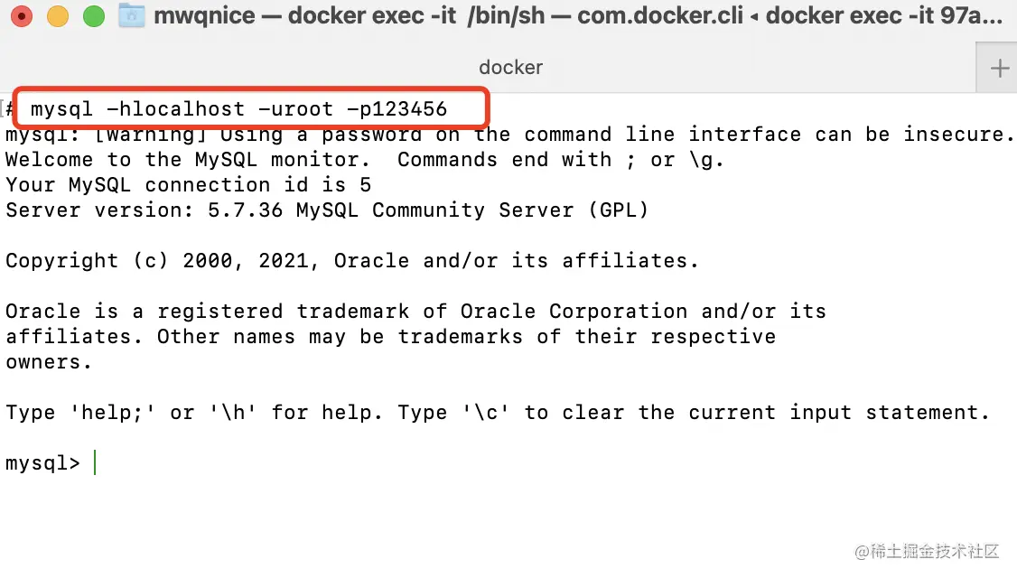 注意事项:最好不要在一行命令中输入密码,我们直接输入的是明文可能会被同一台机器上的其他用户看到,我们可以通过如下命令分为两步进行操作